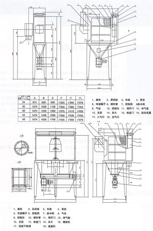 1.箱體部分:進氣口、屏蔽板、濾袋、濾袋框架、側開門、凈氣箱、出氣口